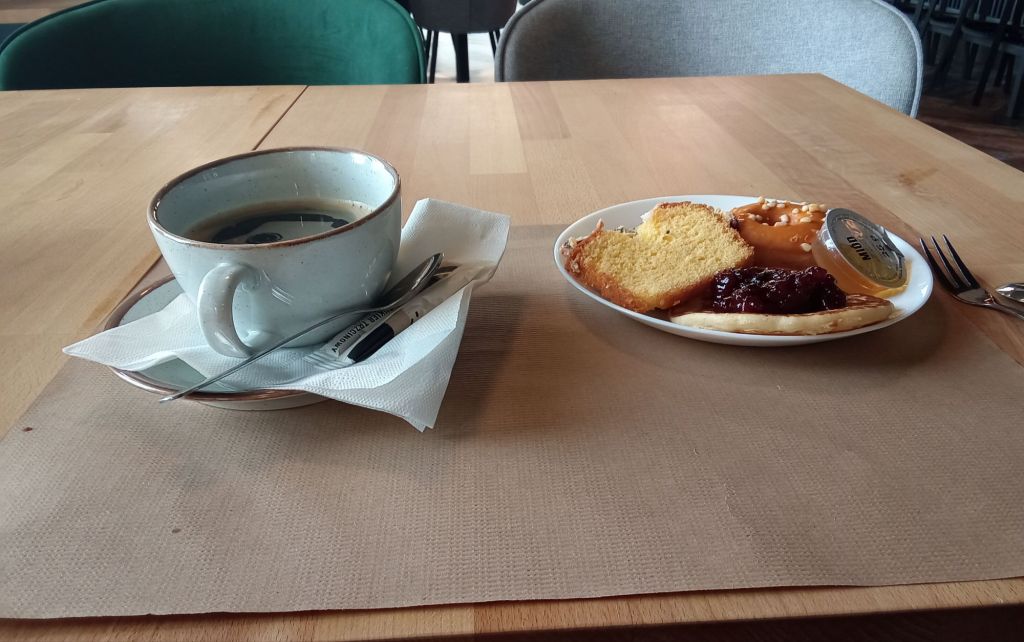 Après cette magnifique chevauchée sauvage, j’arrive donc en ville où j’y accède par une sévère rampe le long du chateau. En haut, je m’installe dans le café d’un hôtel chic en bord de rivière. Je prends quelques pâtisseries pour accompagner mon café. On verra combien la serveuse me fera payer ces gourmandises. Et bien, c’est à nouveau offert par la maison. Trop sympa.