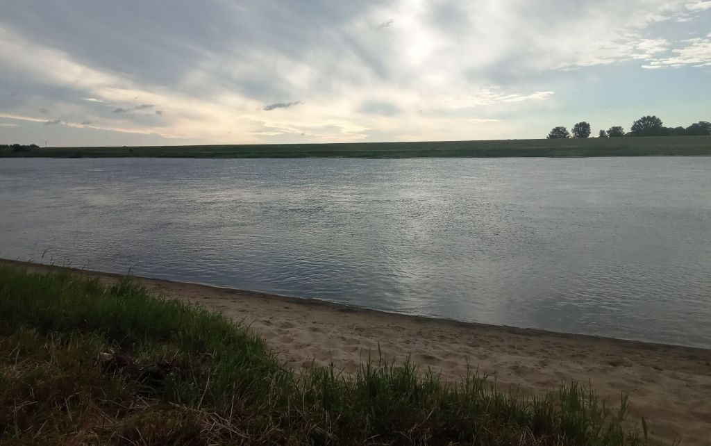 Réveillé à nouveau aux aurores, je replonge pour une grasse mat’ dominicale jusqu’à 6h30. Le vent s’est à nouveau levé. De ce fait, tente et housse vélo sont sèches. Je déjeune copieusement à ma place réservée sur la plage vistulienne. A 7h30, je quitte ce beau bivouac sous un ciel à nouveau voilé. Puis je sors des champs par un chemin de tracteurs, reprends la digue de protection avant de retrouver ma petite route de campagne.