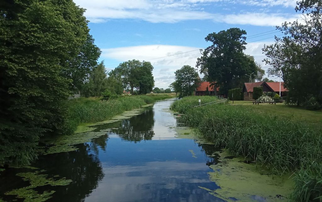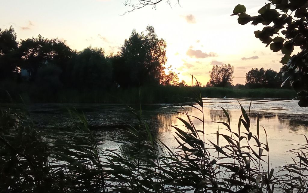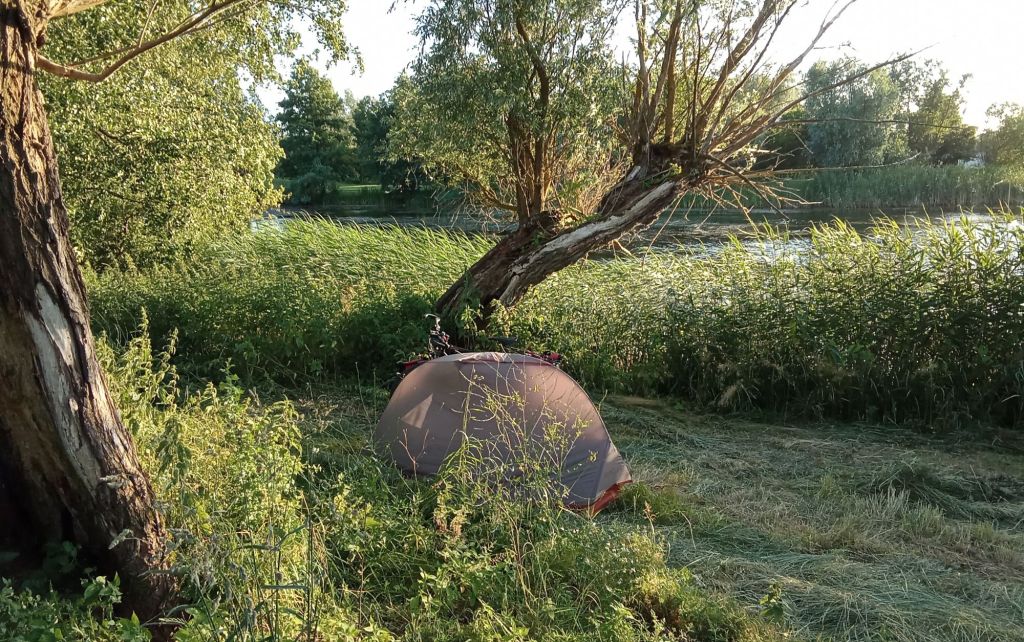 Ce n’est pas le tout de rigoler mais, même si j’avance bon train à plus de 25km/h, l’heure avance aussi. Je longe maintenant la rivière Tuga en suivant mes panneaux EV10. Par contre, la piste est trop étroite et le passage de vélos trop important pour y planter mon bivouac. Je suis obligé de traverser la ville de Nowy Dwór Gdanski puis de m’éloigner de l’autoroute S17 avant d’envisager de trouver un endroit tranquille. Après le hameau de Solnica, je traverse une zone de lacs. J’essaie à gauche mais ce n’est pas concluant. J’essaie à droite et, merci ma bonne étoile, je déniche un coin tranquille au fond d’un champ fraichement coupé et au bord d’un lac. C’est parfait !