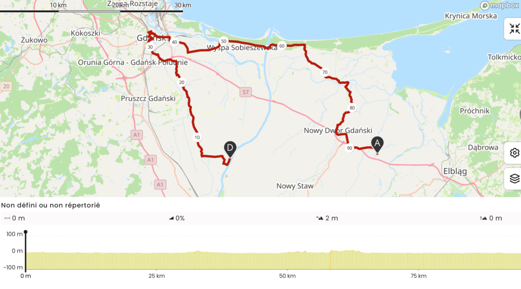 Par contre, il me faut plonger au sud-est pour contourner l’enclave de l’oblast de Kaliningrad. Cette enclave, coincée entre la Pologne et la Lituanie, permet aux Russes d’avoir un accès sur la mer Baltique. C’est d’ailleurs là qu’est amarrée une partie de leur flotte navale. D’ailleurs, une fine bande de terre permettrait d’y accéder. Je continue ma route. De temps en temps, un panneau (avec la marque EV10) rappelle aux automobilistes la limite de dépassement d’un cycliste d’un mètre. Ce qui est marrant est que le cycliste les remercie en tirant son chapeau !