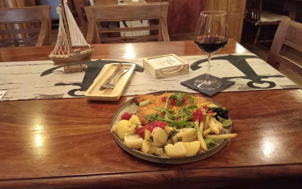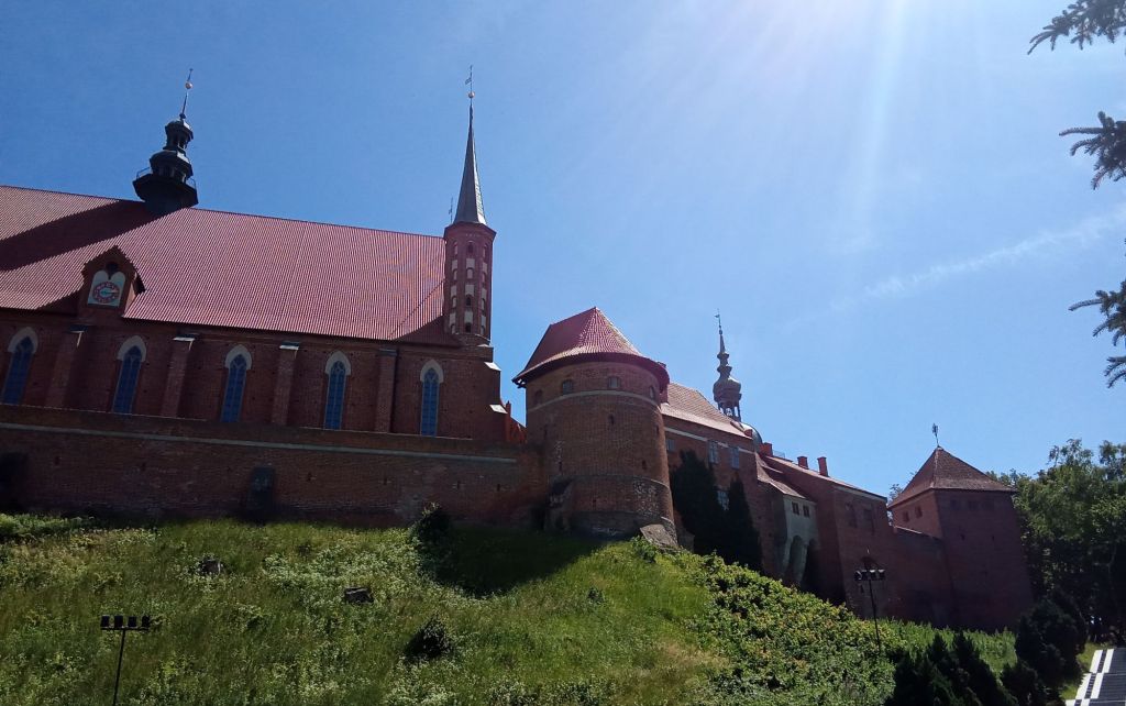 Je rejoins la route bitumée qui mène à la ville « côtière » de Frombork. J’y trouve un bon restau où je me fais plaisir. Ce midi, ce sera (énorme) côte de porc panée avec ses pommes de terre à la vapeur et ses légumes de saison. Le tout accompagné de groseilles et d’un verre de vin rouge. Après ce délicieux repas et un double-espresso, je prends mon dessert dans la pâtisserie du village. En effet, la celle du restau était à 30PLN soit 7€ (aussi cher qu’en France). Alors que le bâton de brownie (un brownie en barre nappé de caramel, de noix et de chocolat noir) à 2,20€ est une tuerie. Après l’avoir mangé en pédalant, j’ai failli faire demi-tour pour en reprendre un autre !