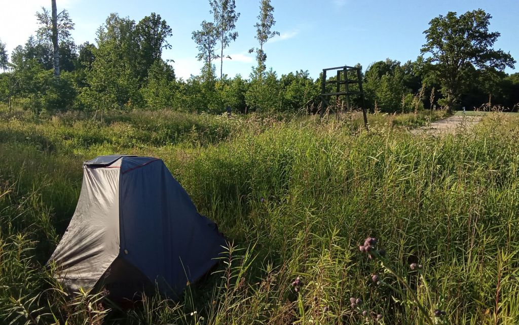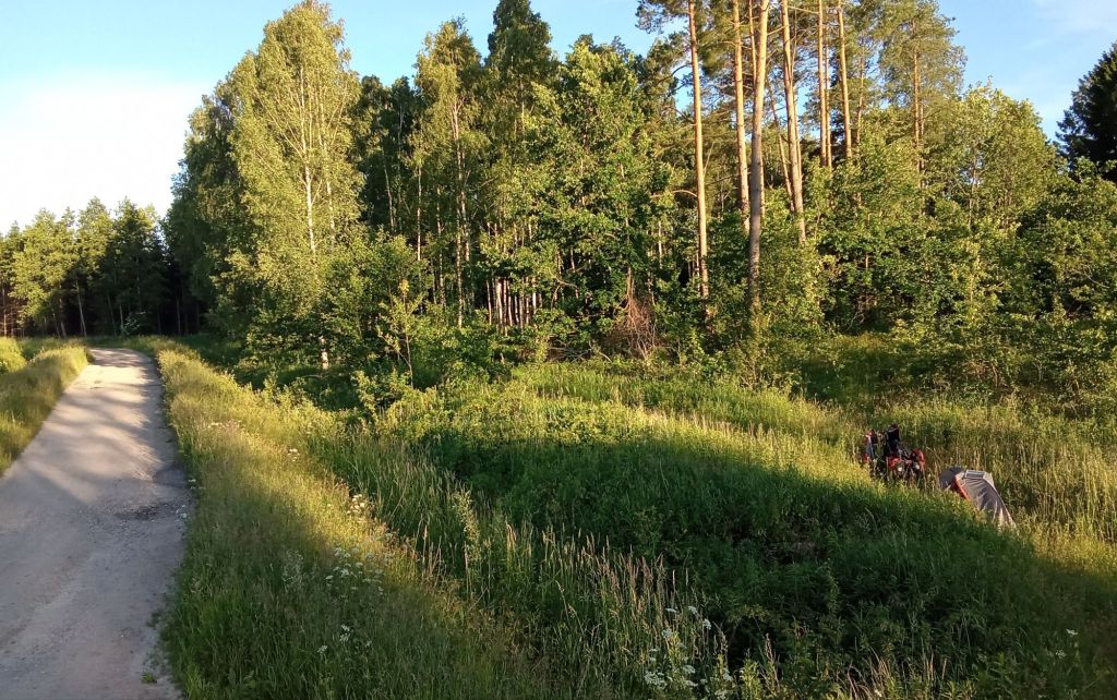 Ce n’est pas le tout de faire le pitre et prendre des photos mais il me faut partir à la pêche au bivouac. Je repère la trace de la GreenVelo qui rejoint ma route à l’est à une dizaine de bornes de là. En effet, la route passe au milieu de cultures céréalières et de marécages. Donc aucune chance de trouver mon bonheur. Une fois arrivé, je ne peux que constater que l’aire MOR est squattée par les jeunes du village. Il me faut remonter la GV et trouver une piste éloignée du village et des fermes isolées. Après quelques minutes, je tombe sur une clairière près d’une coupe de bois avec un promontoire de chasseur. Ce sera parfait pour ce soir. Il est déjà 17h30. J’installe le campement.