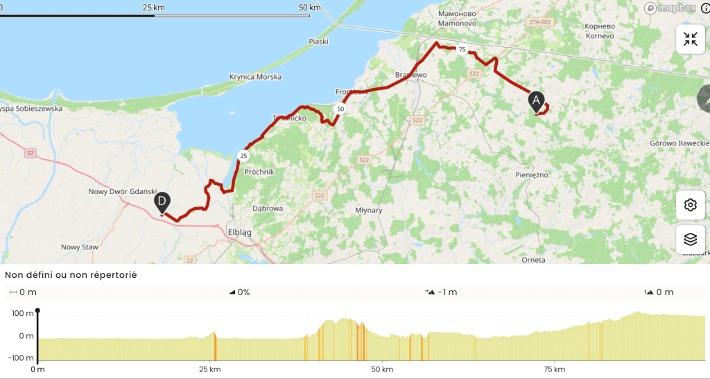 J’entame la seconde partie de la journée benaise comme disait ma grand-mère maternelle. Je quitte cette belle bourgade de Frombork à la magnifique cathédrale fortifiée. Par contre, les panneaux EV10 ont disparu ! Je pense qu’il doit y avoir des conflits avec certaines régions.