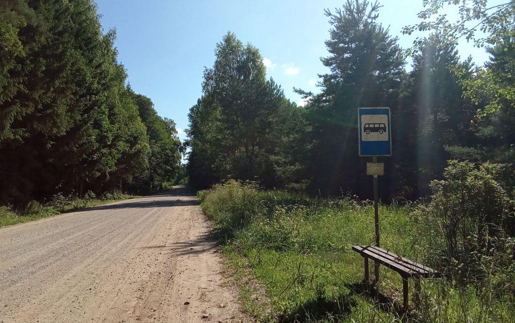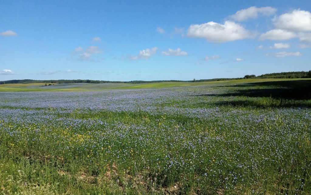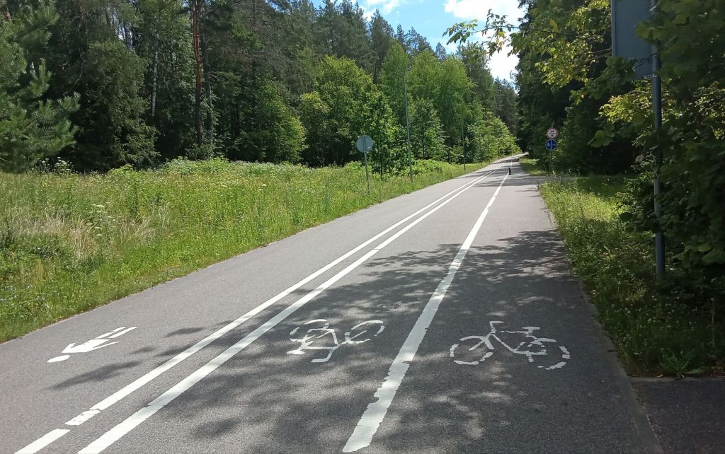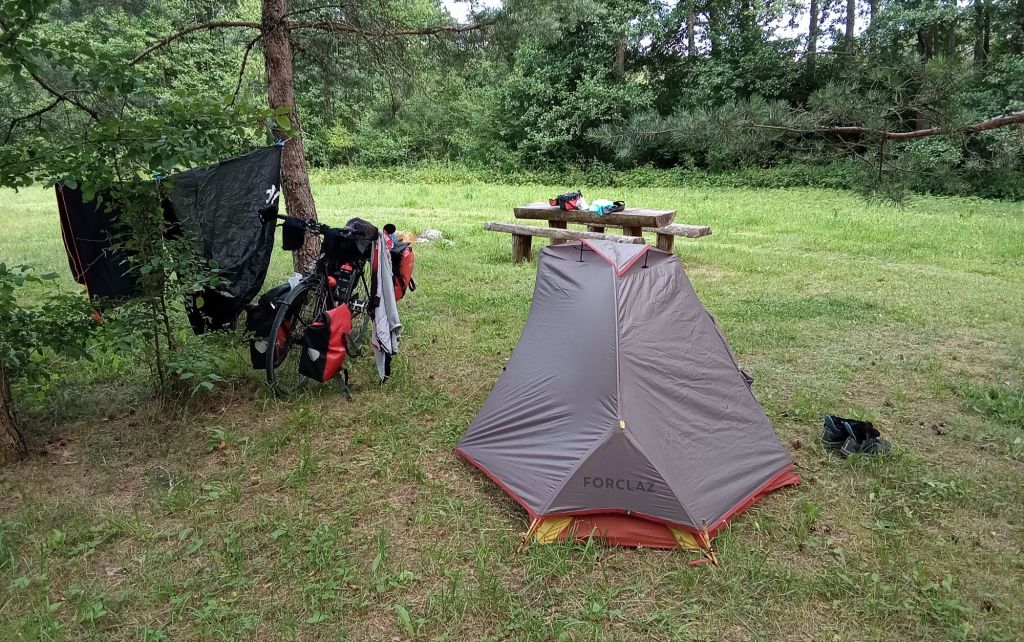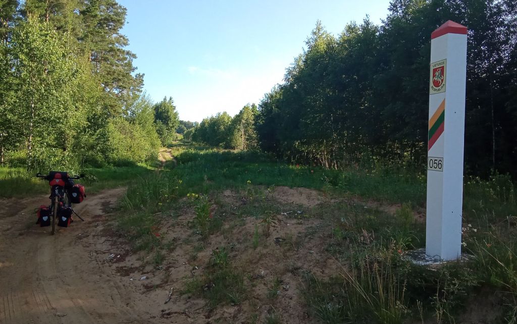 Bien planqué à l’abri du soleil et de la pluie sous mes frondaisons et bien installé sur mon lit confortable de mousse et mon matelas gonflable de décath’, je ne me réveille qu’à 6h45. Je déjeune sur mon banc installé au soleil. Puis, une fois le campement levé, je prends la route à 7h30. Enfin ce que je pense être 7h30 à la montre de mon compteur. En effet, l’heure a changé sur mon téléphone. En Lituanie, il est en fait 8h30. Je reprends la « route » en ce 63è jour de périple.
