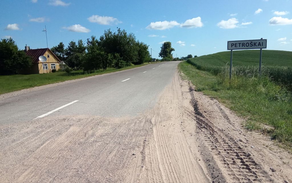 Après avoir évité quelques gamelles, je parviens, après 12kms et 1h30 de pistes depuis mon départ, dans mon premier village lituanien : Petroskai. Enfin village est un bien grand mot. C’est à nouveau un hameau avec quelques maisons en bois le long de cette route bitumée. Je m’arrête devant la première où j’aperçois âme qui vive. C’est une vieille femme en train de nettoyer des légumes dans une bassine. Je lui demande de me remplir ma gourde vu que je suis à sec depuis un moment.