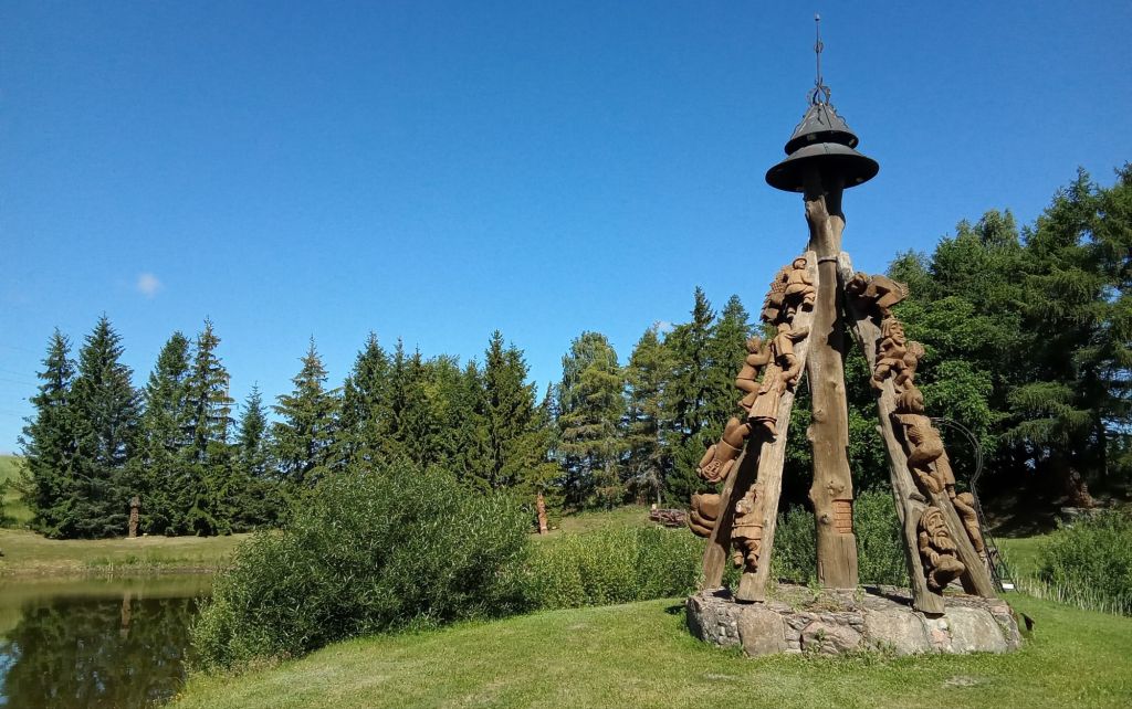 Parvenu dans la première ville à Veisiejai, je fais un stop à l’entrée pour visiter le parc aux sculptures en bois dont celle-ci assez rigolote avec tous ces personnages qui grimpent pour décrocher le pompon.