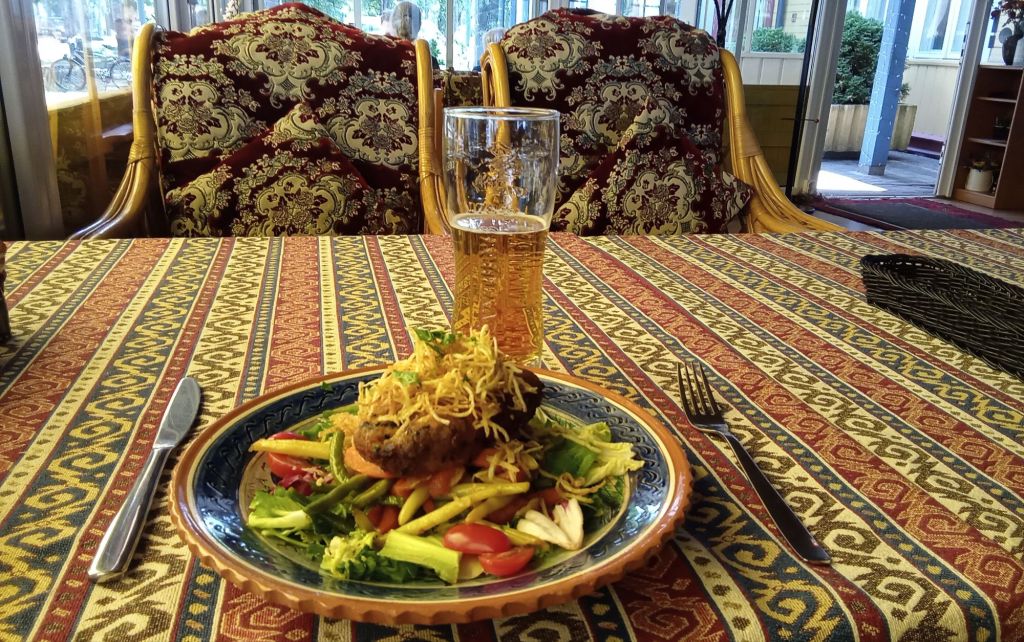 Il est un peu plus de 13h heure locale. J’ai les crocs. Je trouve un restau très sympa où je déguste un poulet farci avec légumes accompagné d’une bonne bière lituanienne. La charmante serveuse échange dans un parfait anglais et m’adresse également quelques mots en français (« Bon appétit monsieur!« ) pendant le service.