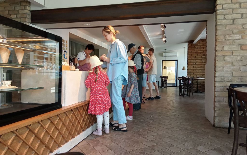 Par contre, je suis obligé de rentrer à l’intérieur pour recharger mes batteries et surtout préparer mon entrée en Lituanie (langue à télécharger, carte à étudier, blog à finaliser). Dehors, avec le soleil , je n’y vois goutte. Une cliente lituanienne, parlant anglais, assure la traduction pour ma commande matinale : un café noir (à la turque) et une pâtisserie (ce sera cheese-cake avec glace à la vanille et coulis de caramel).