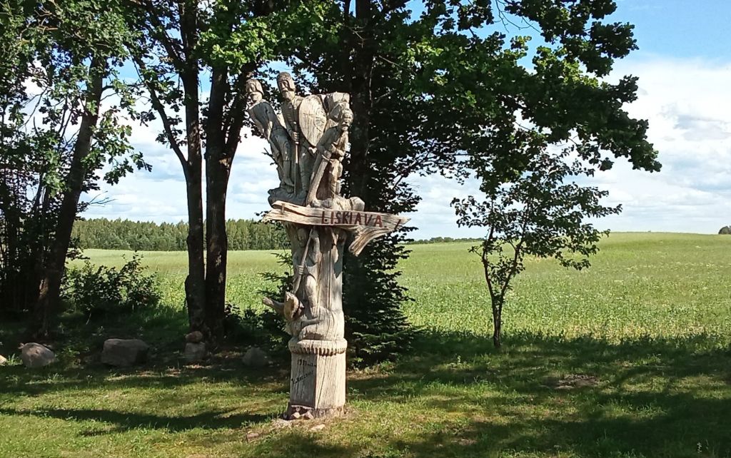 Puis, arrivé au carrefour avec la route principale 133, remonter tout droit vers l’est. A ce carrefour, ce n’est pas un giratoire avec une quelconque déco, là c’est une sculpture en bois représentant des guerriers lituaniens.
