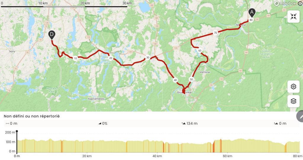 Après une interminable ligne droite à travers la forêt, j’arrive dans la charmante ville de Merkiné. Il était temps. Je n’ai plus d’eau et les magasins sont encore plus rares qu’en Pologne. Je monte également sur le belvédère pour admirer le paysage.