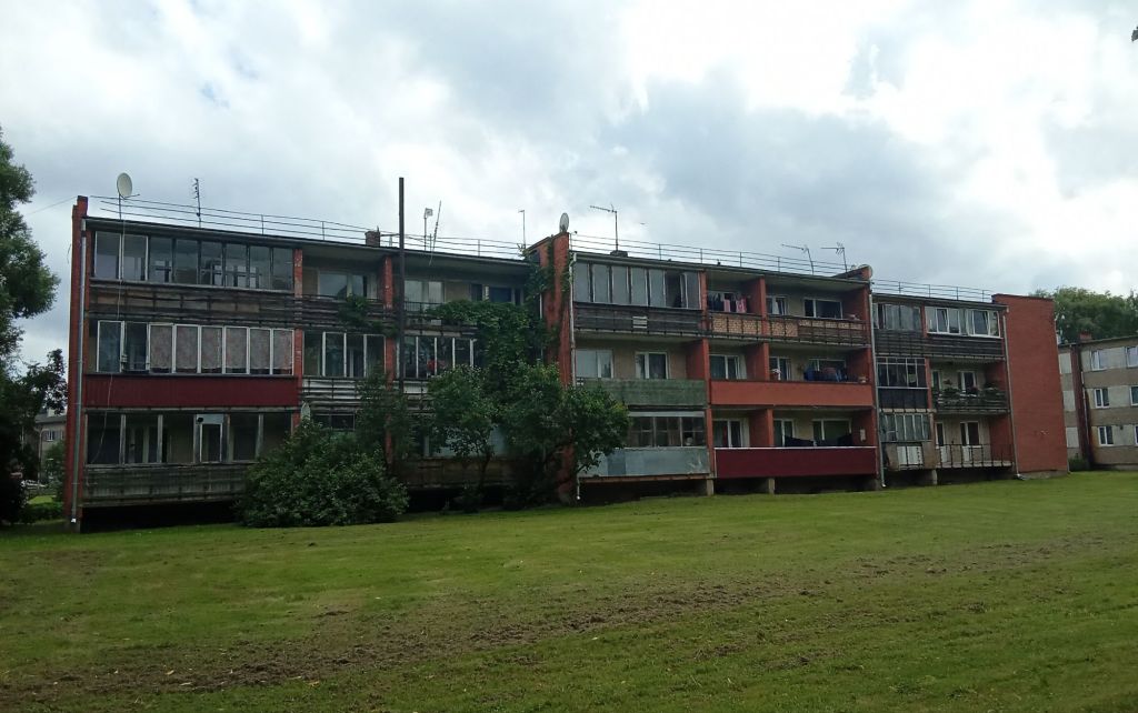 Vers 13h, je rejoins la bourgade ouvrière de Stalgene. Les bâtiments sont aussi austères qu’en Lituanie. Je pense que ce sont les ouvriers agricoles et de l’usine à l’entrée de la bourgade qui résident ici. Quant à moi, je me rends à la seule épicerie de la bourgade mais à l’opposé de cette cité. Pour aller faire ses courses, ce n’est pas bien pratique. J’y achète de quoi pique-niquer vu qu’il n’y a aucun autre commerce.